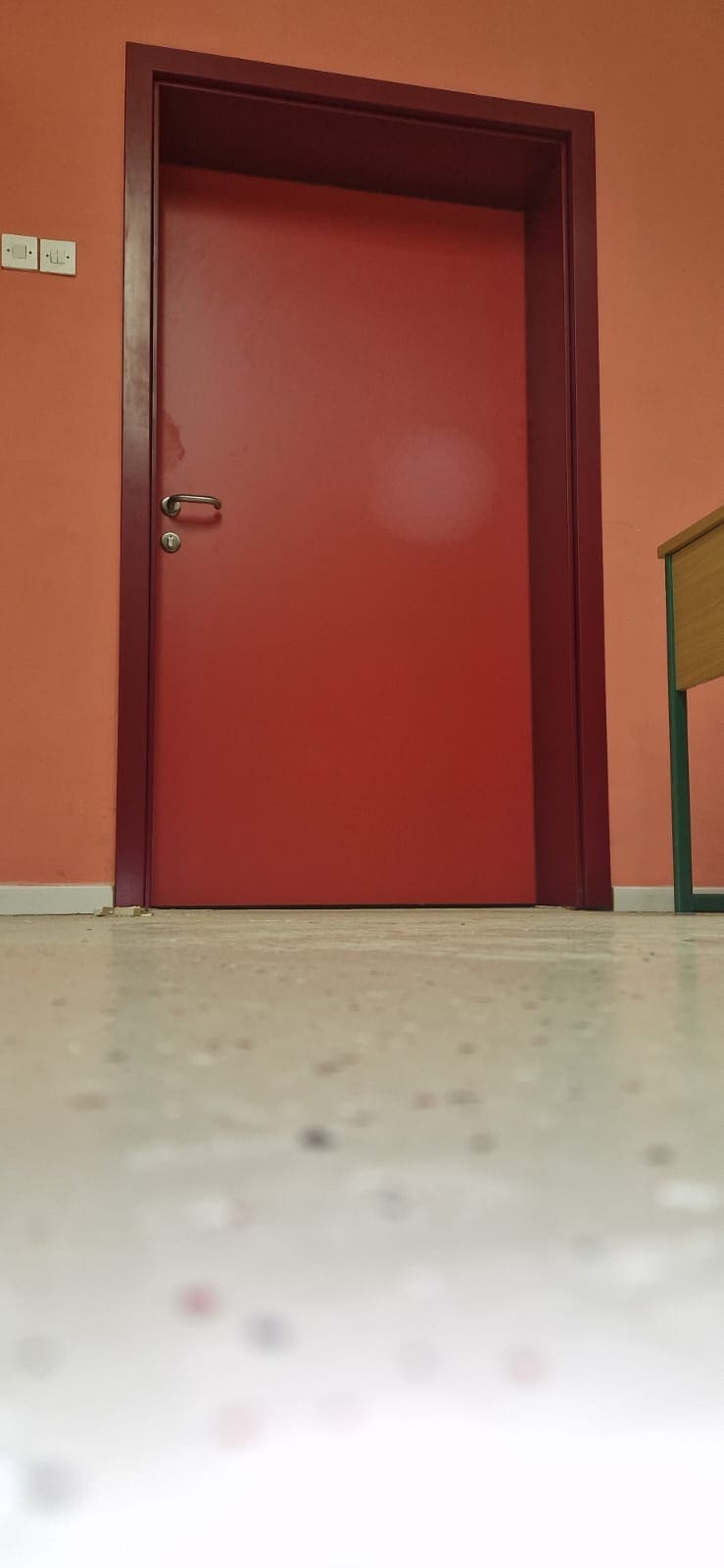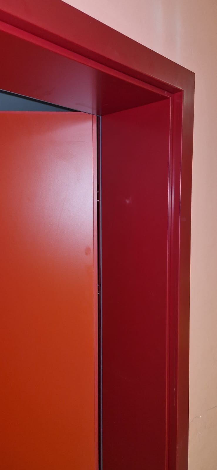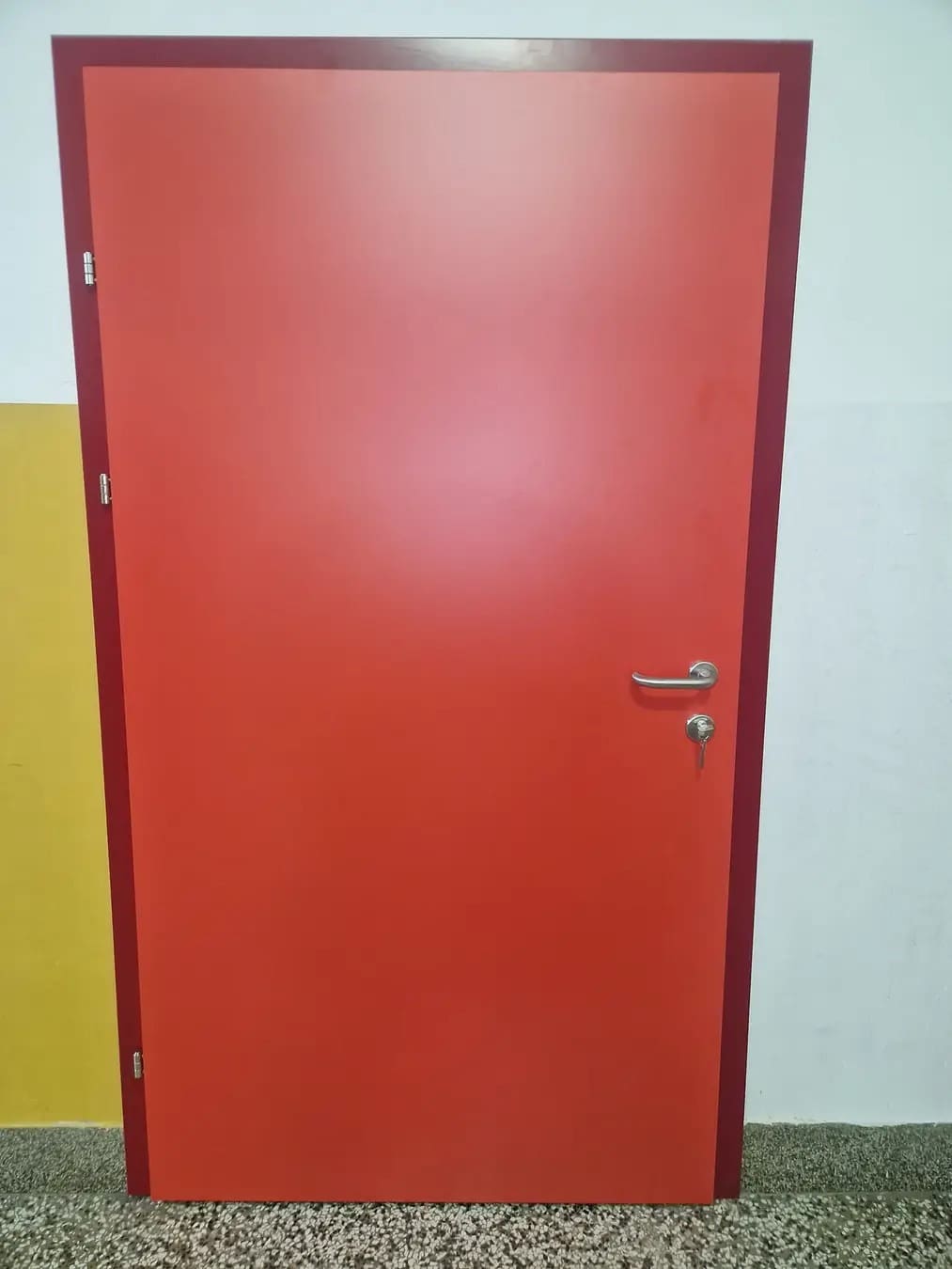 Vratno krilo je iz programa HPL i investitor je odabrao crvenu boju FUNDERMAX FH 0210. Vrata su lako održavaju i čiste te su otporna na habanje, vanjska oštećenja i ogrebotine.